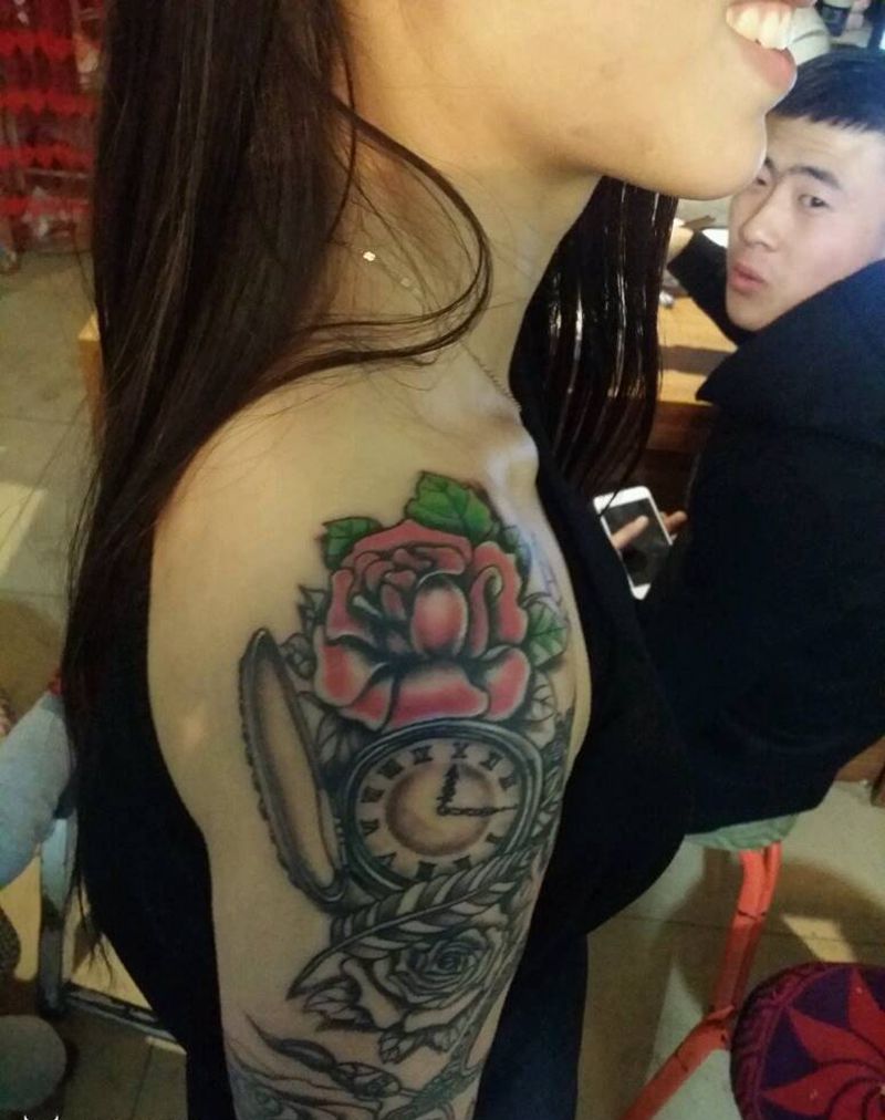 当前位置: 首页 >山西省太原市纹身店-太原翼龙刺青工作室纹身图案>网络红人王金金同款花臂未完成纹身图片_肩部手臂欧美动物植物静物成品纹身图案