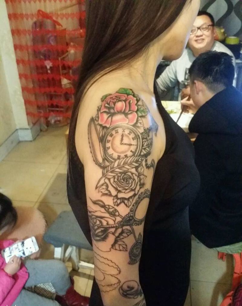 当前位置: 首页 >山西省太原市纹身店-太原翼龙刺青工作室纹身图案>网络红人王金金同款花臂未完成纹身图片_肩部手臂欧美动物植物静物成品纹身图案
