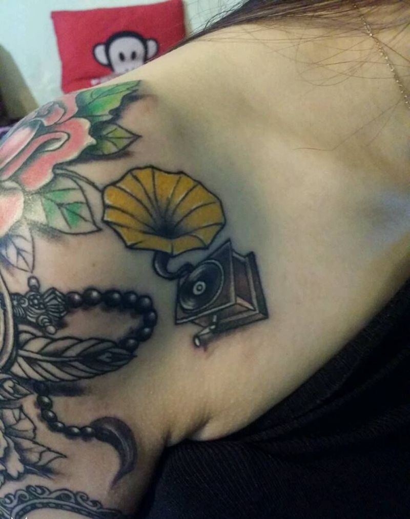 当前位置: 首页 >山西省太原市纹身店-太原翼龙刺青工作室纹身图案>网络红人王金金同款花臂未完成纹身图片_肩部手臂欧美动物植物静物成品纹身图案