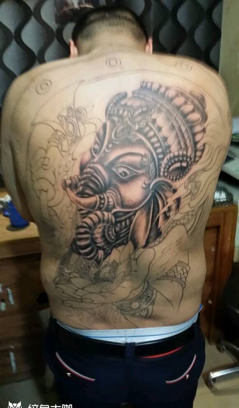 当前位置: 首页 >山西省太原市纹身店-太原翼龙刺青工作室纹身图案>象神未完成纹身图片_背部手臂腿部纹身图案