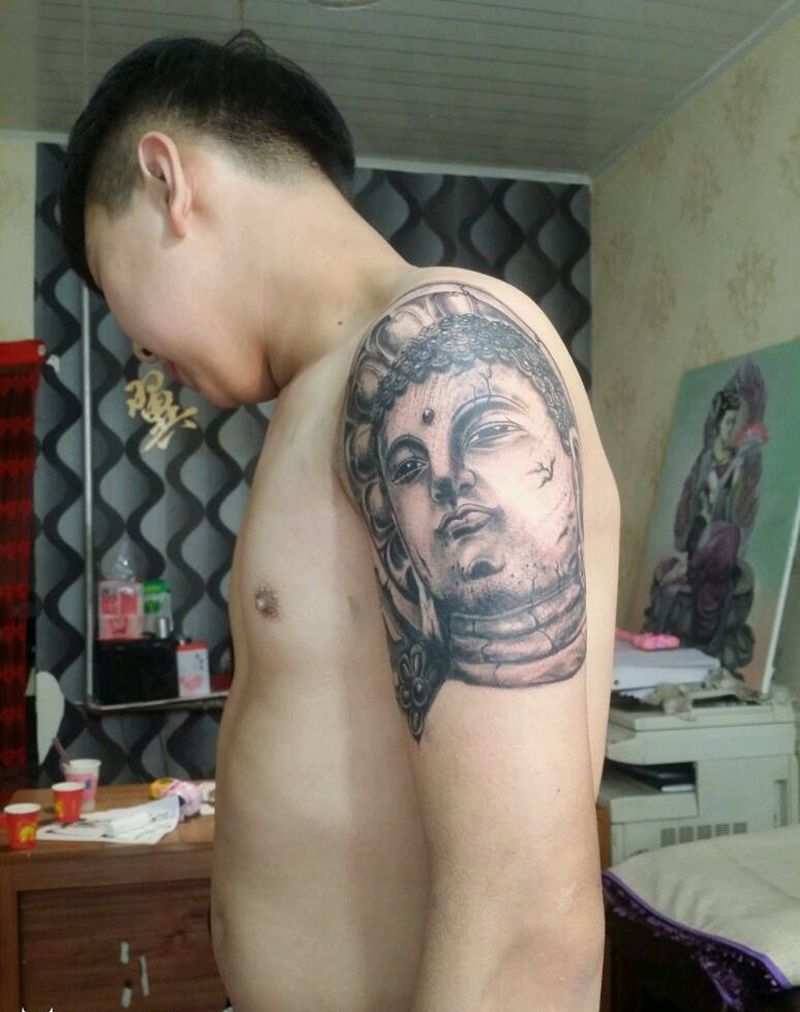 当前位置: 首页 >山西省太原市纹身店-太原翼龙刺青工作室纹身图案>石佛纹身图片_肩部胸部背部手臂手部传统习俗鬼神宗教成品纹身图案