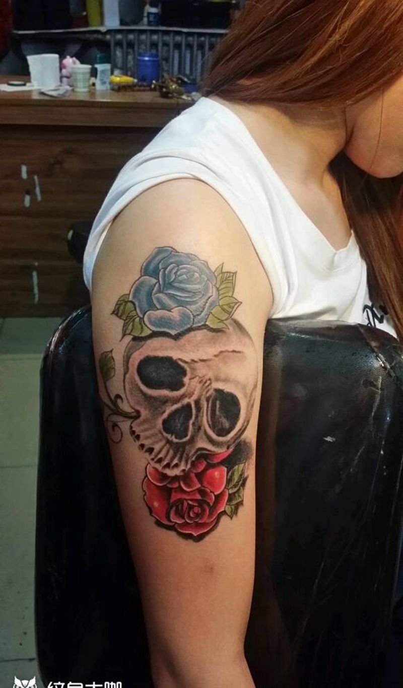 当前位置: 首页 >山西省太原市纹身店-太原翼龙刺青工作室纹身图案>骷髅玫瑰纹身图片_肩部背部手臂腿部欧美植物静物成品纹身图案