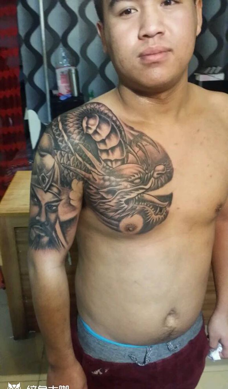 当前位置: 首页 >山西省太原市纹身店-太原翼龙刺青工作室纹身图案>关公盘龙半甲纹身图片_肩部胸部传统习俗肖像动物人物成品纹身图案