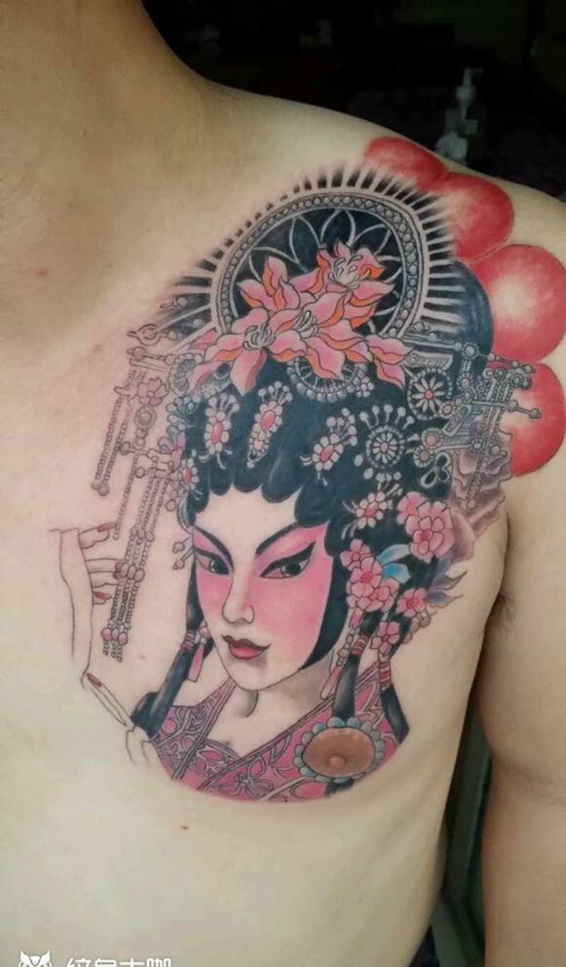 当前位置: 首页 >山西省太原市纹身店-太原翼龙刺青工作室纹身图案>花旦纹身图片_肩部胸部手臂传统习俗肖像国画人物原创成品纹身图案