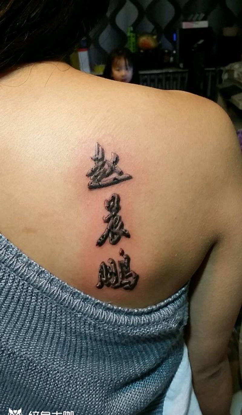 当前位置: 首页 >山西省太原市纹身店-太原翼龙刺青工作室纹身图案>记忆纹身图片_肩部背部字符原创成品纹身图案