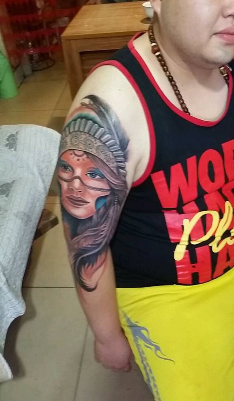 当前位置: 首页 >山西省太原市纹身店-太原翼龙刺青工作室纹身图案>印第安美女!纹身图片_肩部手臂腿部传统肖像人物成品纹身图案