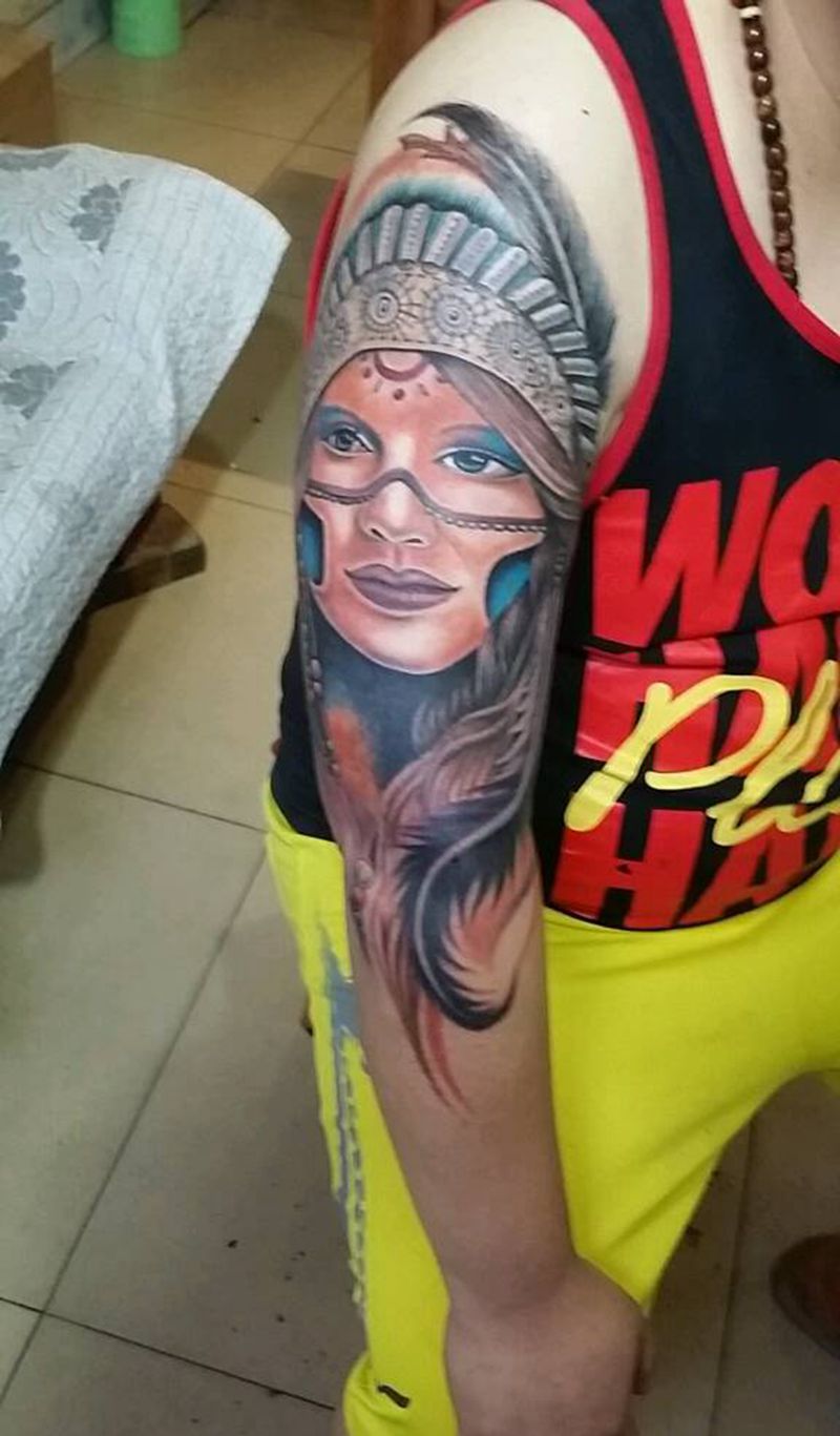 当前位置: 首页 >山西省太原市纹身店-太原翼龙刺青工作室纹身图案>印第安美女!纹身图片_肩部手臂腿部传统肖像人物成品纹身图案