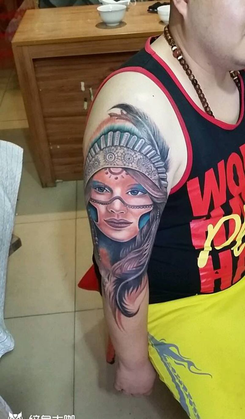当前位置: 首页 >山西省太原市纹身店-太原翼龙刺青工作室纹身图案>印第安美女!纹身图片_肩部手臂腿部传统肖像人物成品纹身图案