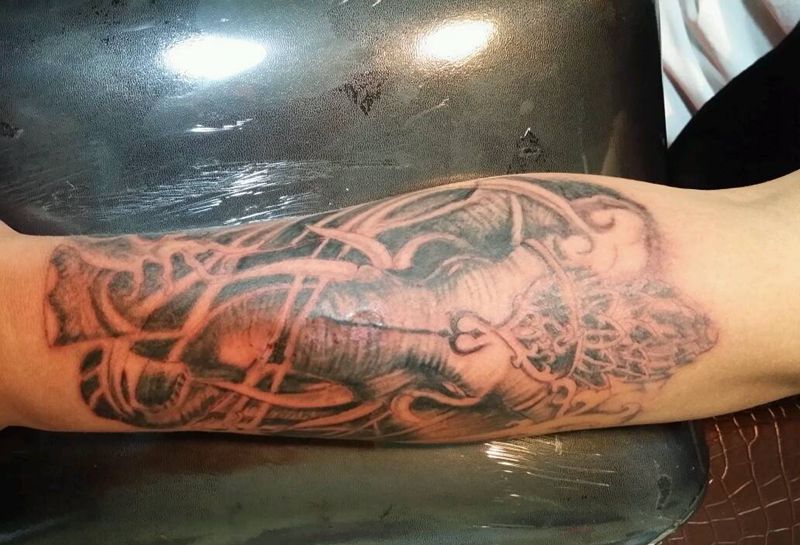当前位置: 首页 >山西省太原市纹身店-太原翼龙刺青工作室纹身图案>象神纹身图片_手臂腿部动物鬼神成品纹身图案