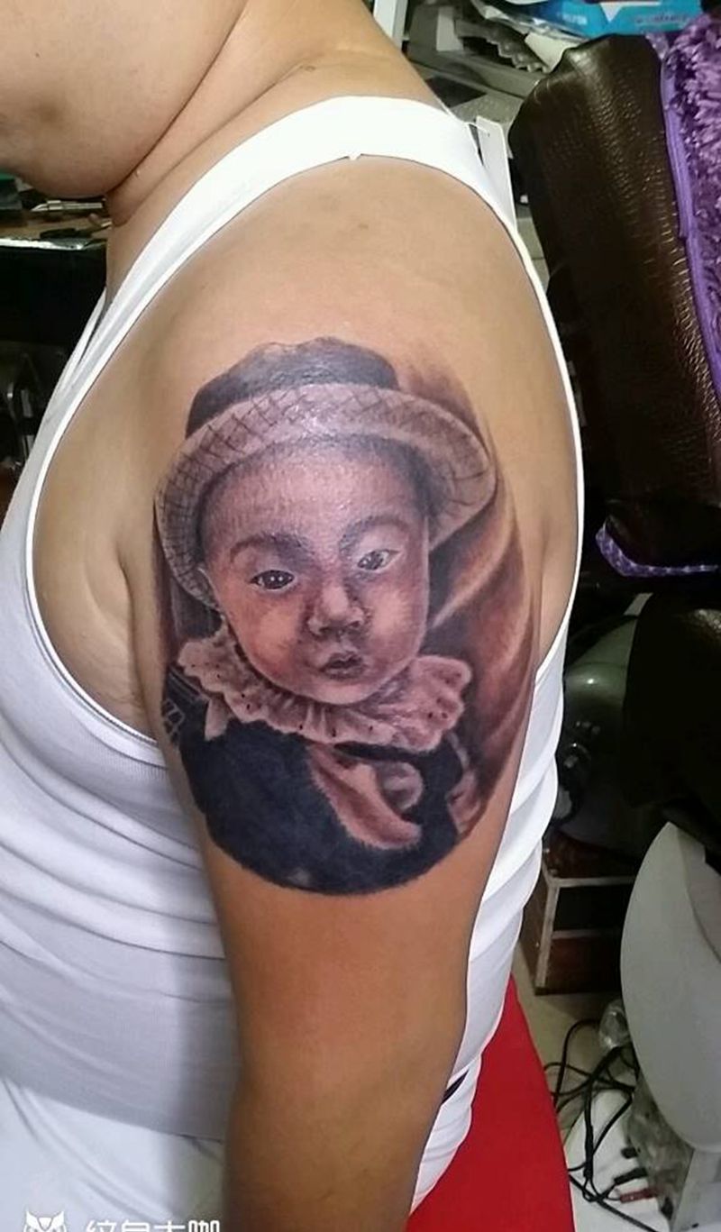 当前位置: 首页 >山西省太原市纹身店-太原翼龙刺青工作室纹身图案>父爱纹身图片_肩部肖像人物原创成品纹身图案
