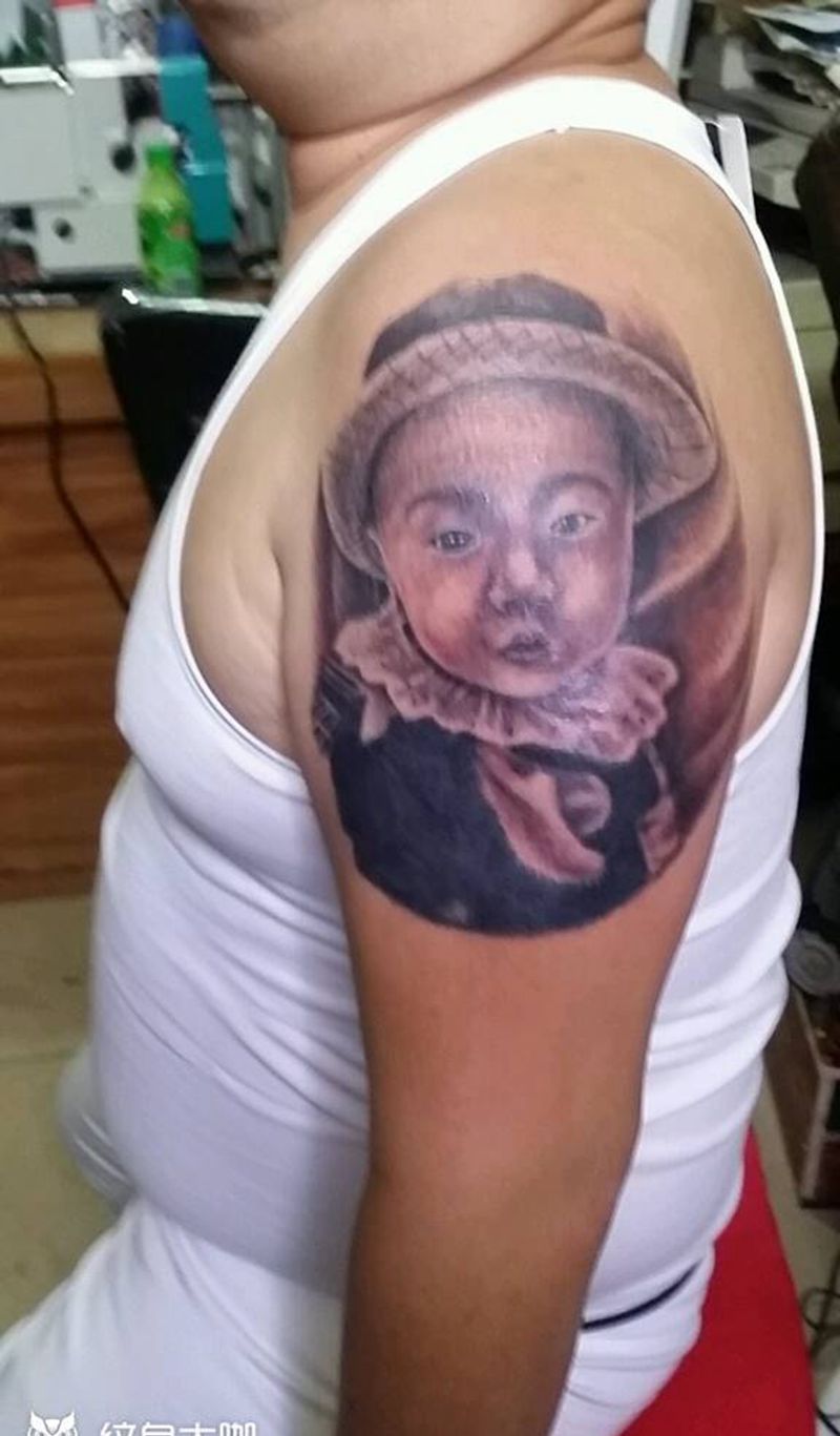 当前位置: 首页 >山西省太原市纹身店-太原翼龙刺青工作室纹身图案>父爱纹身图片_肩部肖像人物原创成品纹身图案