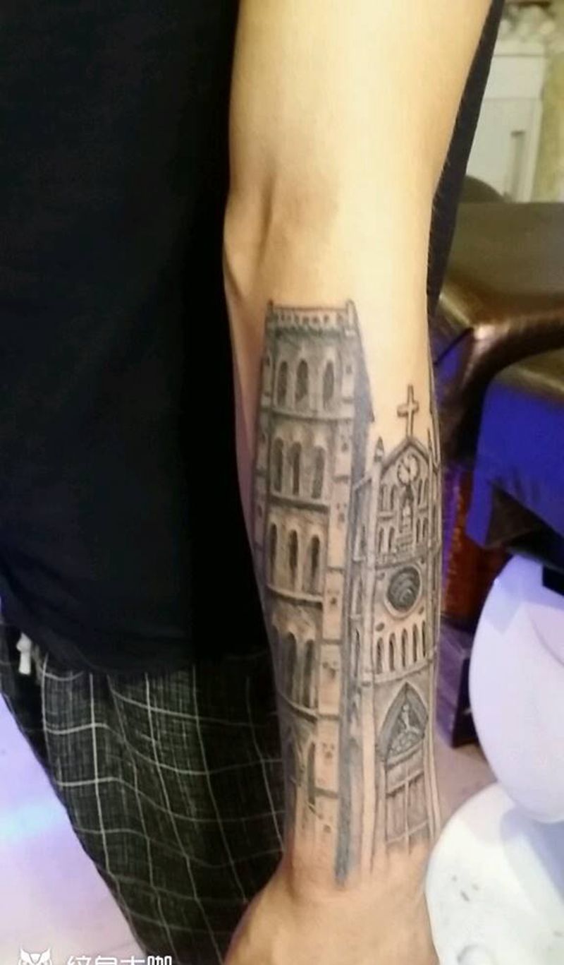 当前位置: 首页 >山西省太原市纹身店-太原翼龙刺青工作室纹身图案>教堂纹身图片_肩部手臂手部几何静物纹身图案
