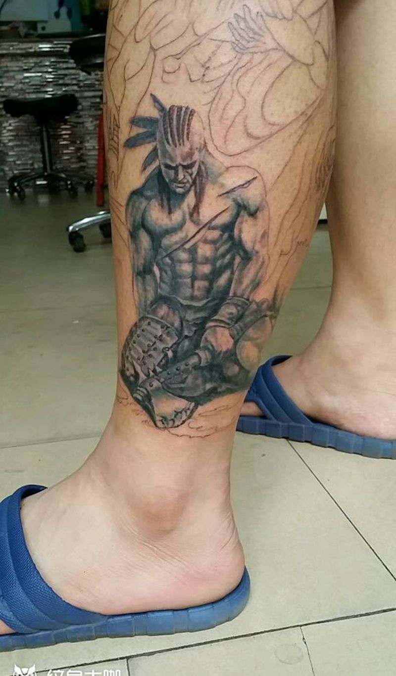 当前位置: 首页 >山西省太原市纹身店-太原翼龙刺青工作室纹身图案>生与死纹身图片_腿部欧美肖像人物鬼神纹身图案