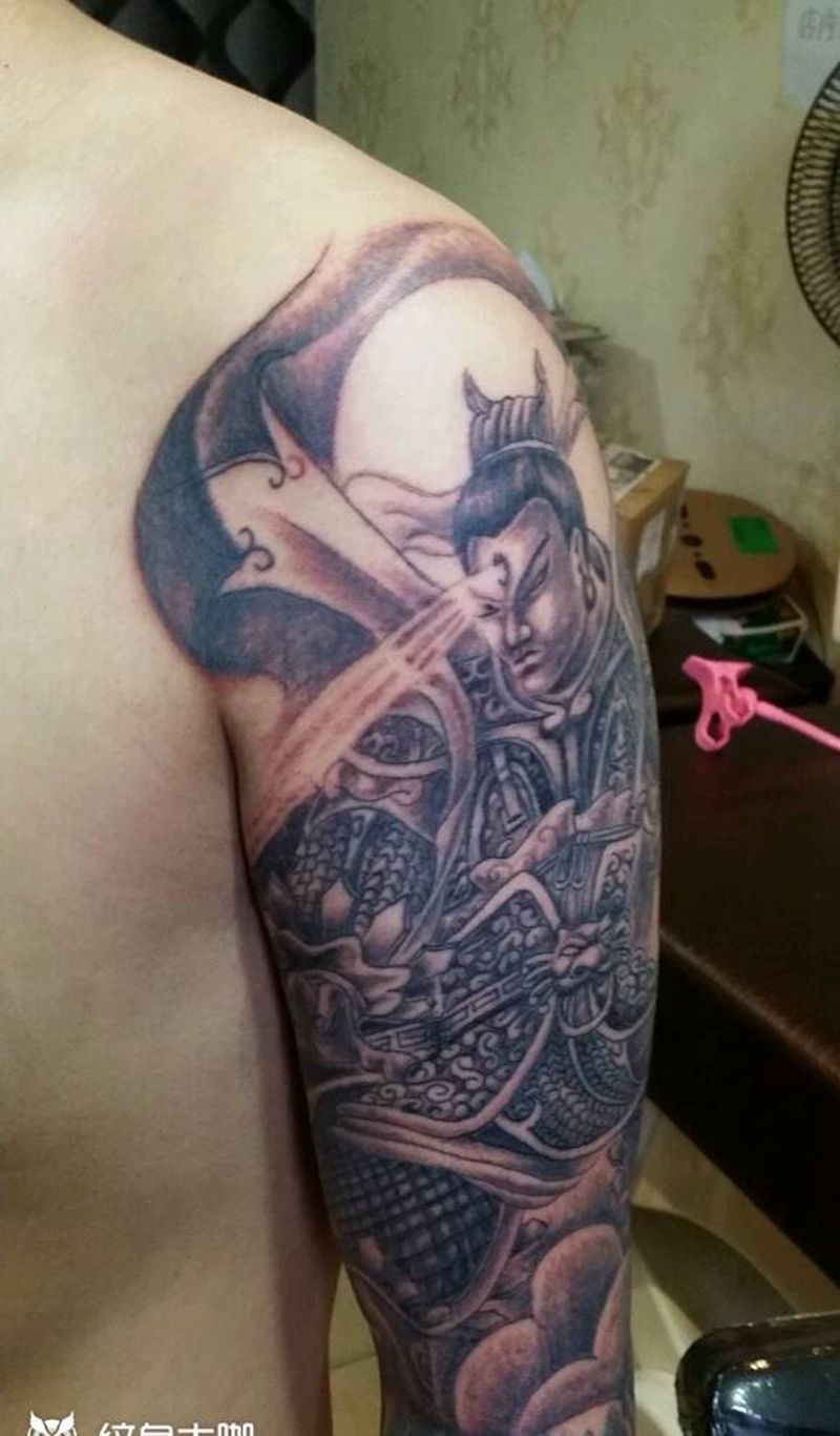 当前位置: 首页 >山西省太原市纹身店-太原翼龙刺青工作室纹身图案>二郎神包大臂纹身图片_手臂传统习俗肖像鬼神纹身图案