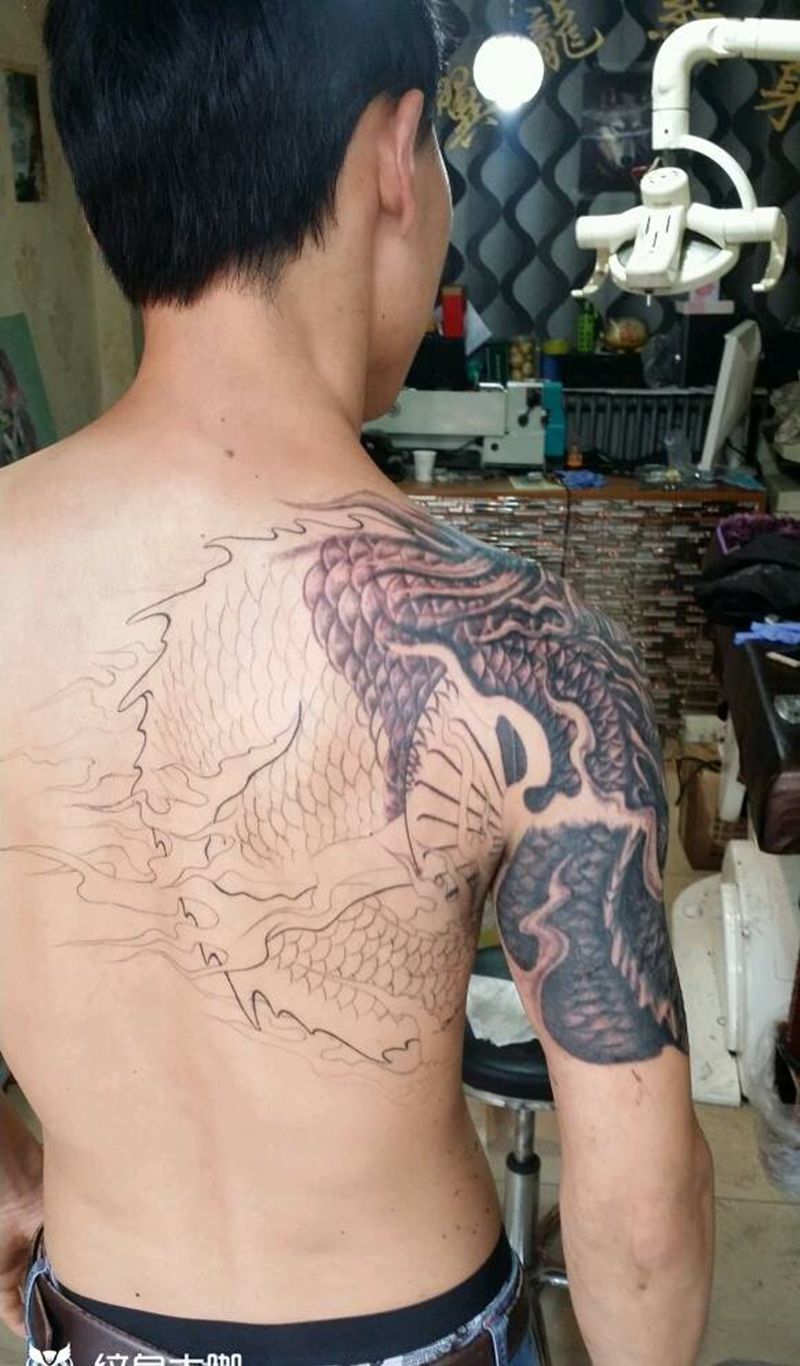 当前位置: 首页 >山西省太原市纹身店-太原翼龙刺青工作室纹身图案>过肩龙纹身图片_肩部背部手臂传统动物鬼神手稿纹身图案