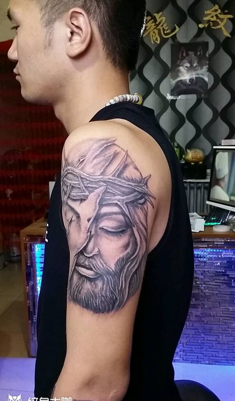 耶稣纹身图片_肩部手臂欧美成品纹身图案