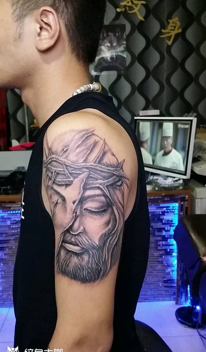 耶稣纹身图片_肩部手臂欧美成品纹身图案