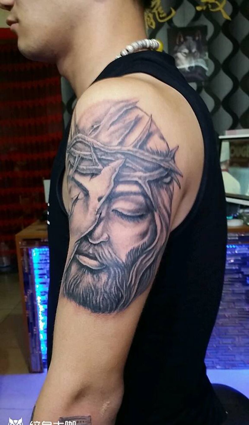 耶稣纹身图片_肩部手臂欧美成品纹身图案