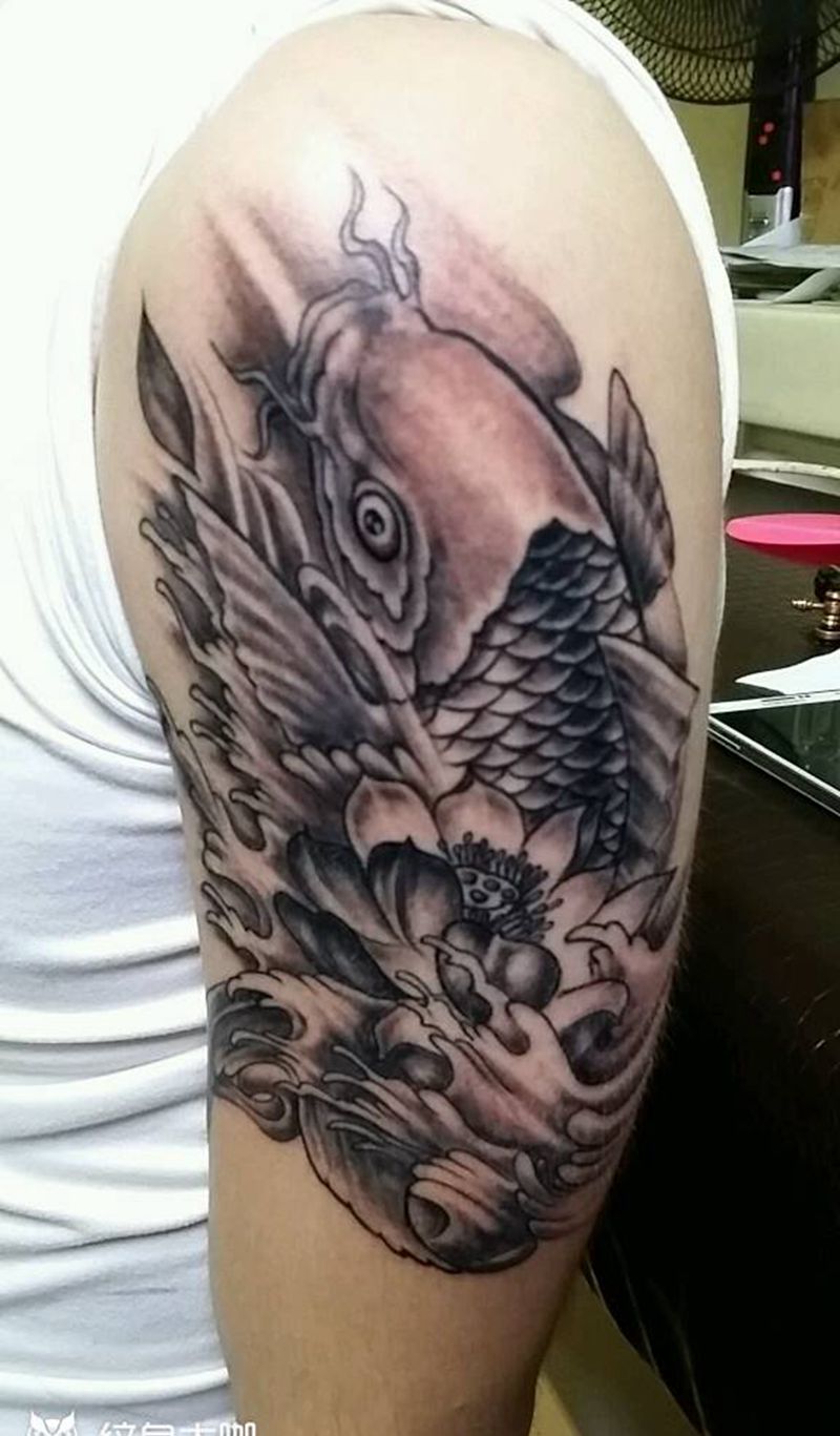 当前位置: 首页 >山西省太原市纹身店-太原翼龙刺青工作室纹身图案>招财鱼纹身图片_肩部胸部背部手臂腿部动物植物成品纹身图案
