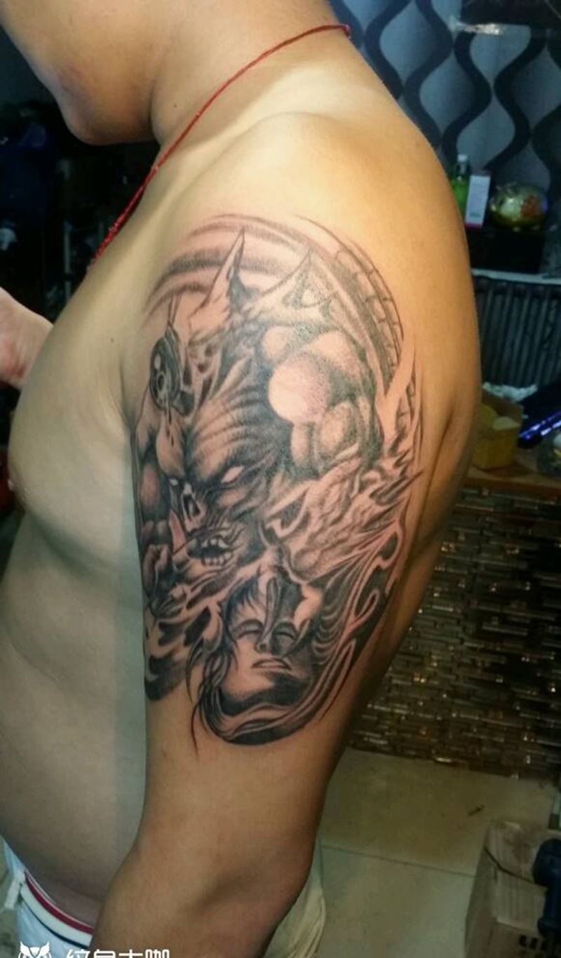 战神刑天纹身图片_肩部手臂人物鬼神成品纹身图案