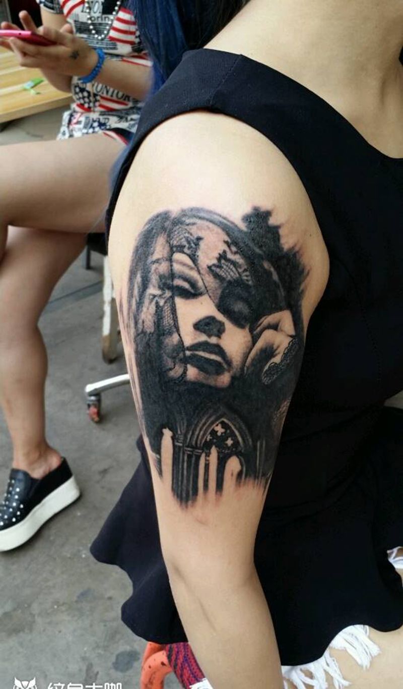 当前位置: 首页 >山西省太原市纹身店-太原翼龙刺青工作室纹身图案>太原翼龙刺青作品纹身图片_肩部手臂欧美肖像人物静物成品纹身图案