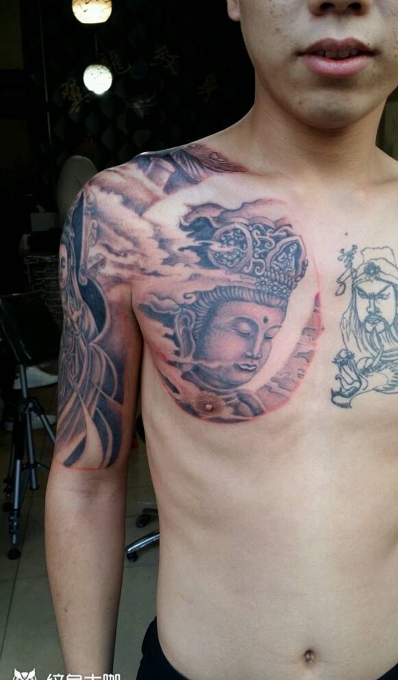 当前位置: 首页 >山西省太原市纹身店-太原翼龙刺青工作室纹身图案>蟠桃会纹身图片_肩部胸部传统人物鬼神成品纹身图案