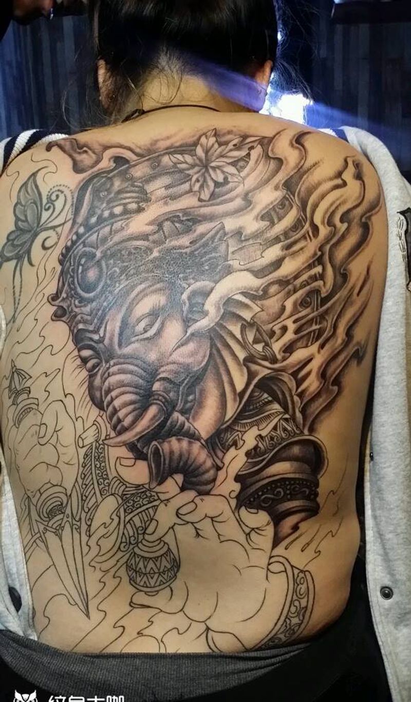 招财象神纹身图片_背部动物鬼神宗教手稿纹身图案