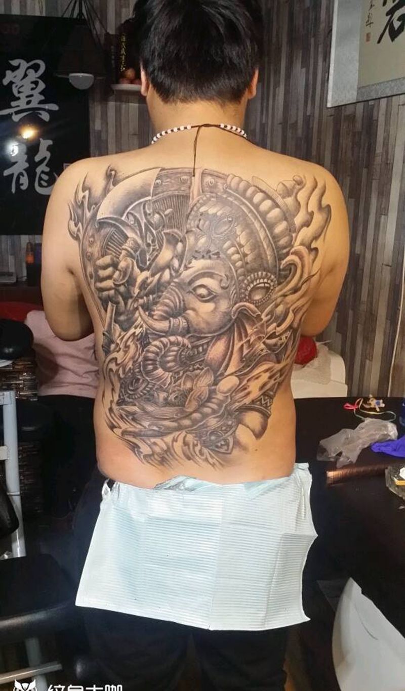 当前位置: 首页 >山西省太原市纹身店-太原翼龙刺青工作室纹身图案>象神完工纹身图片_背部传统动物鬼神宗教成品纹身图案