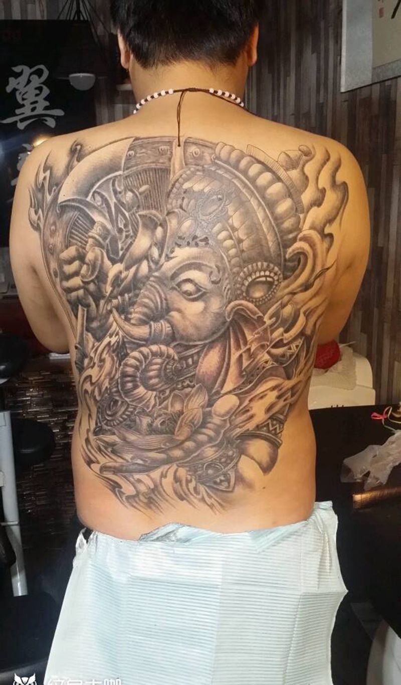 当前位置: 首页 >山西省太原市纹身店-太原翼龙刺青工作室纹身图案>象神完工纹身图片_背部传统动物鬼神宗教成品纹身图案