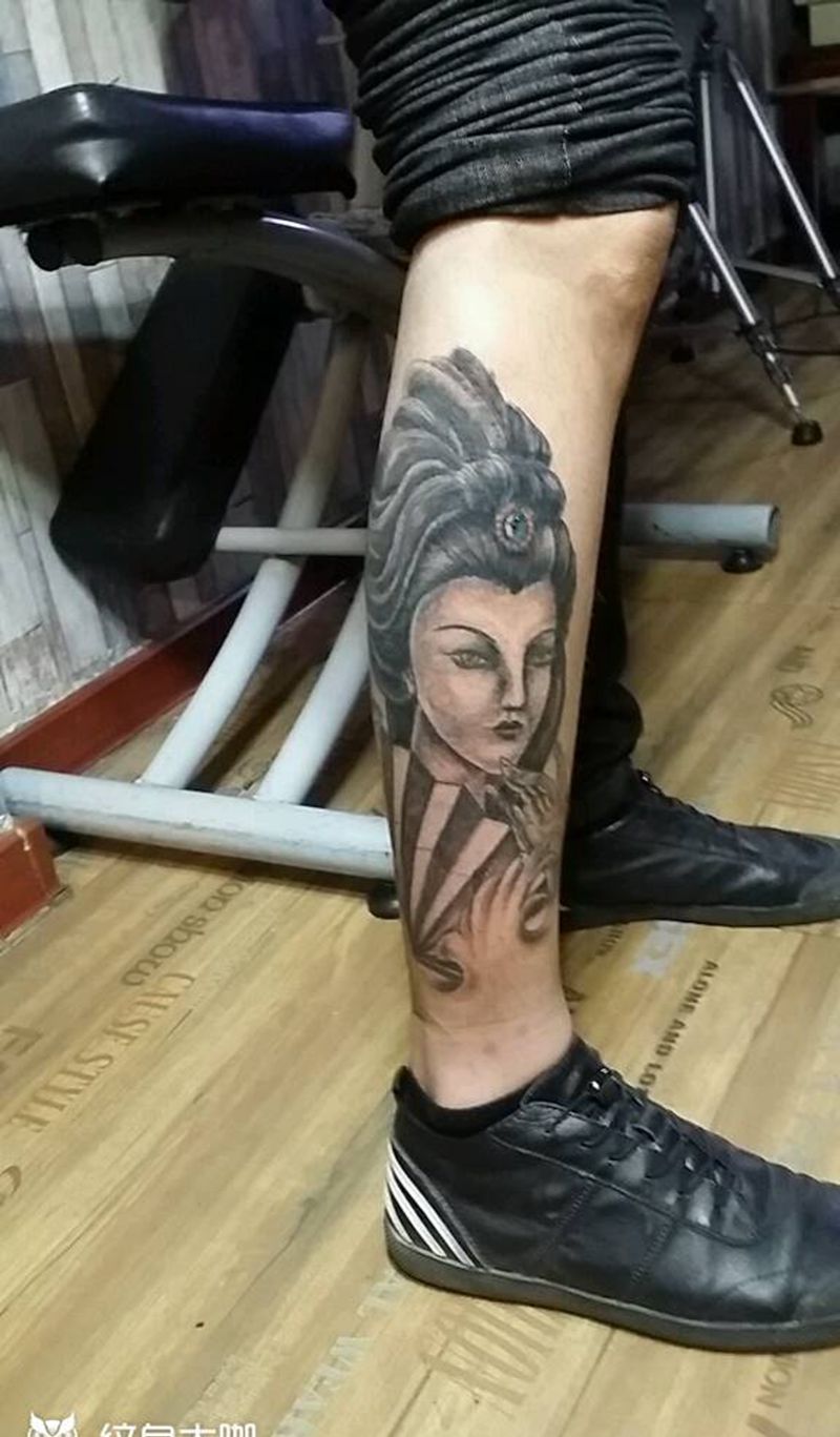 当前位置: 首页 >山西省太原市纹身店-太原翼龙刺青工作室纹身图案>艺妓纹身图片_腿部传统肖像人物成品纹身图案