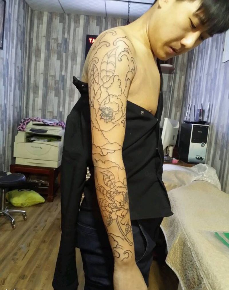当前位置: 首页 >山西省太原市纹身店-太原翼龙刺青工作室纹身图案>浪花牡丹花臂纹身图片_肩部手臂手部静物成品手稿纹身图案