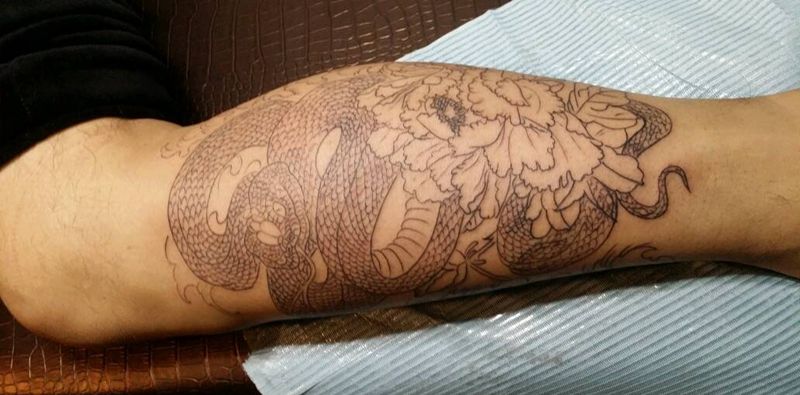 当前位置: 首页 >山西省太原市纹身店-太原翼龙刺青工作室纹身图案>富贵牡丹纹身图片_腿部传统动物静物手稿纹身图案