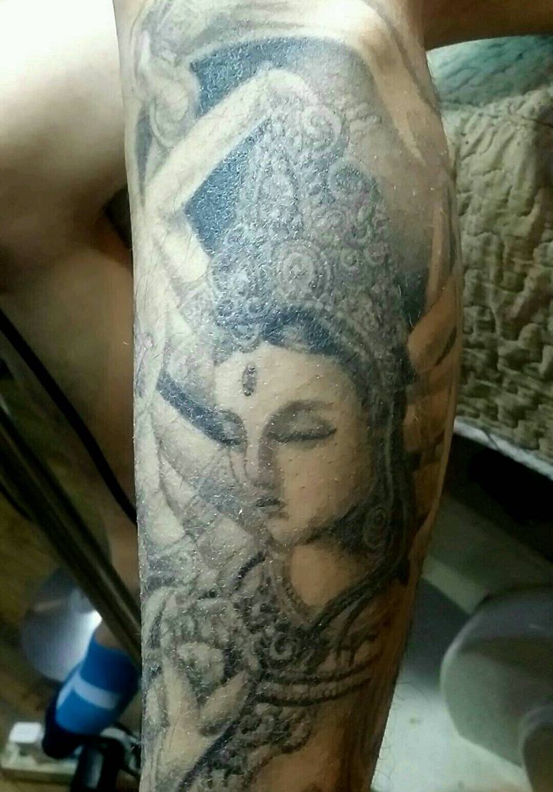 花腿纹身图片_腿部传统习俗肖像鬼神手稿纹身图案