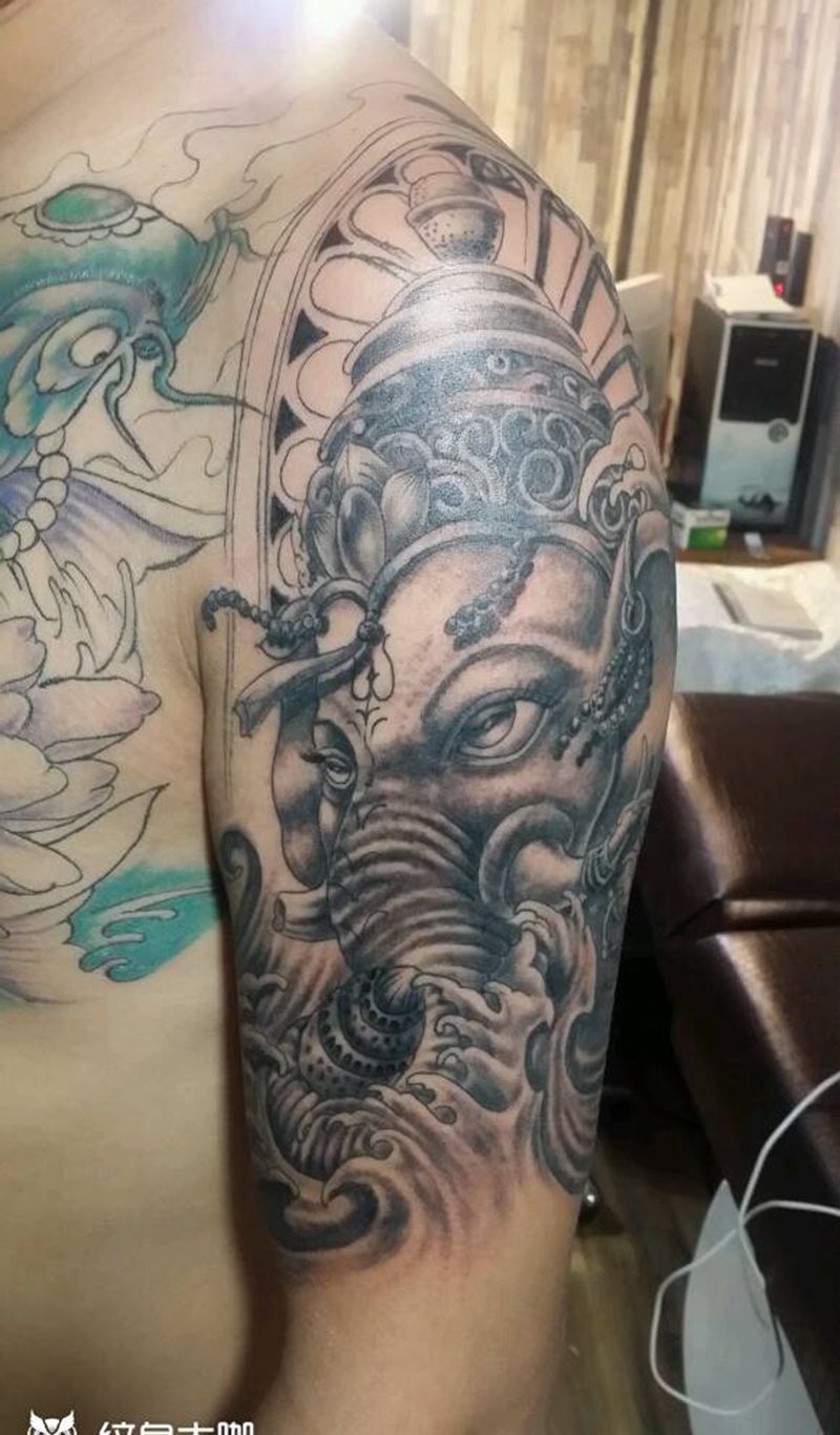 招财半甲纹身图片_胸部手臂欧美传统动物鬼神宗教插画纹身图案