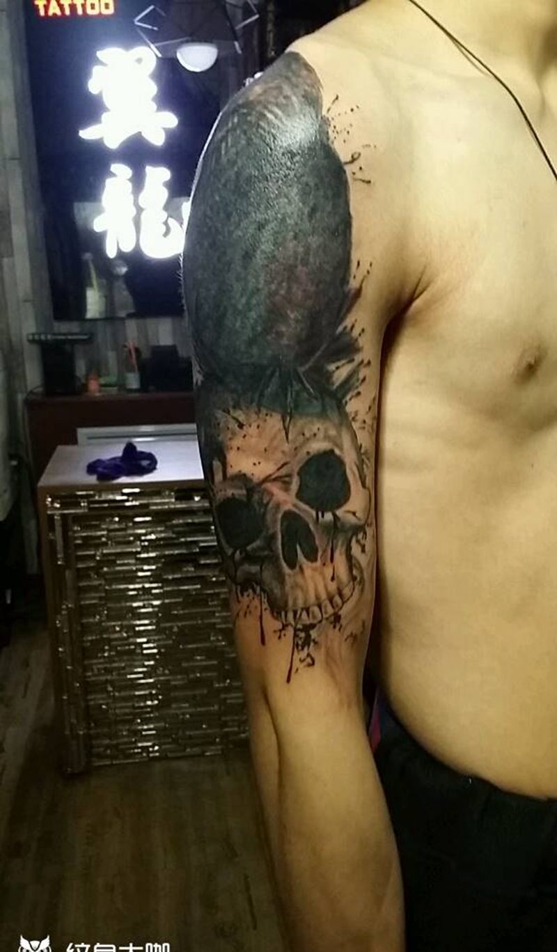 当前位置: 首页 >山西省太原市纹身店-太原翼龙刺青工作室纹身图案>水墨骷髅乌鸦纹身图片_手臂传统动物人物成品纹身图案