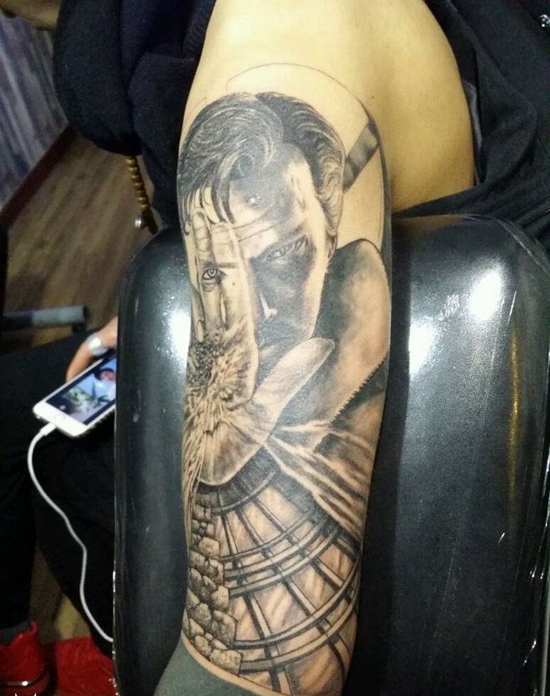 当前位置: 首页 >山西省太原市纹身店-太原翼龙刺青工作室纹身图案>奇异博士纹身图片_手臂欧美传统人物静物原创成品手稿纹身图案