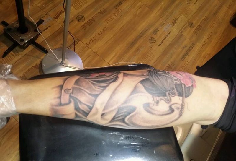 当前位置: 首页 >山西省太原市纹身店-太原翼龙刺青工作室纹身图案>艺妓纹身图片_腿部脚部传统肖像人物成品纹身图案