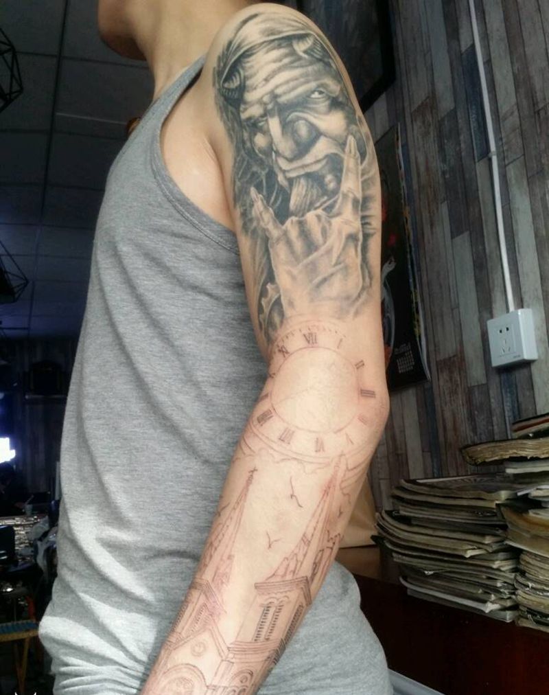 当前位置: 首页 >山西省太原市纹身店-太原翼龙刺青工作室纹身图案>教堂的钟声纹身图片_肩部手臂手部欧美写实人物静物鬼神成品手稿纹身图案