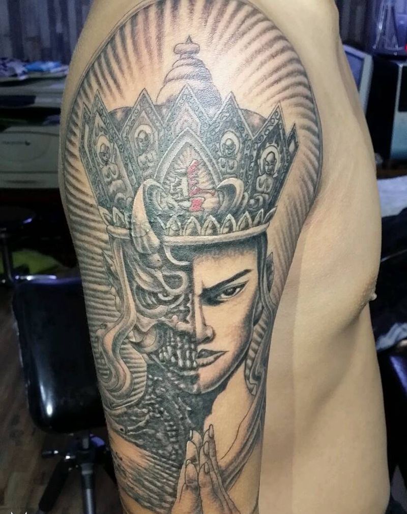当前位置: 首页 >山西省太原市纹身店-太原翼龙刺青工作室纹身图案>一念之间纹身图片_肩部胸部手臂传统人物鬼神成品手稿纹身图案