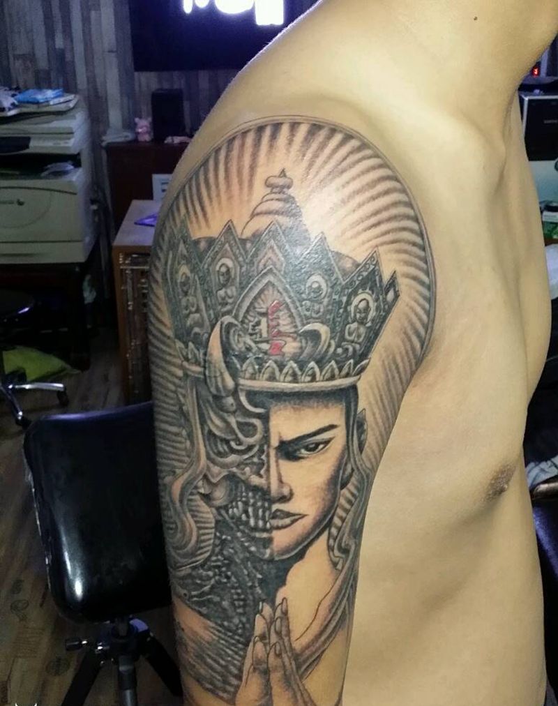 当前位置: 首页 >山西省太原市纹身店-太原翼龙刺青工作室纹身图案>一念之间纹身图片_肩部胸部手臂传统人物鬼神成品手稿纹身图案