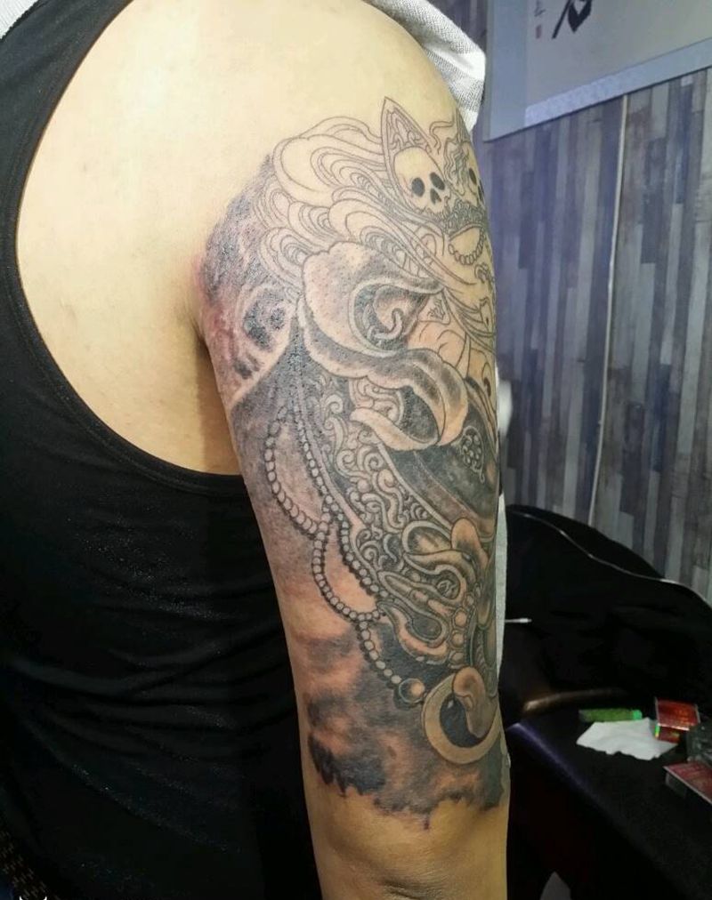 当前位置: 首页 >山西省太原市纹身店-太原翼龙刺青工作室纹身图案>大黑天纹身图片_手臂传统鬼神成品手稿纹身图案