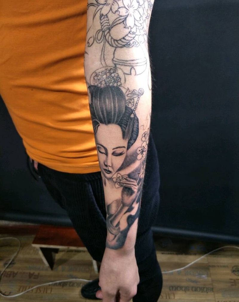 当前位置: 首页 >山西省太原市纹身店-太原翼龙刺青工作室纹身图案>艺妓花臂纹身图片_肩部手臂传统人物成品纹身图案