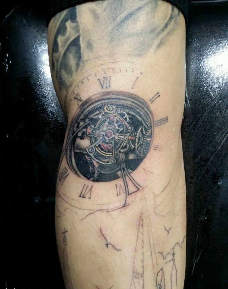 当前位置: 首页 >山西省太原市纹身店-太原翼龙刺青工作室纹身图案>陀飞轮纹身图片_手臂欧美写实静物成品手稿插画纹身图案