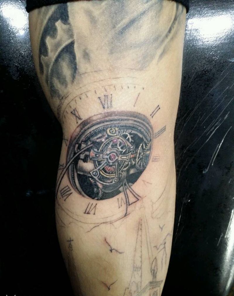 当前位置: 首页 >山西省太原市纹身店-太原翼龙刺青工作室纹身图案>陀飞轮纹身图片_手臂欧美写实静物成品手稿插画纹身图案