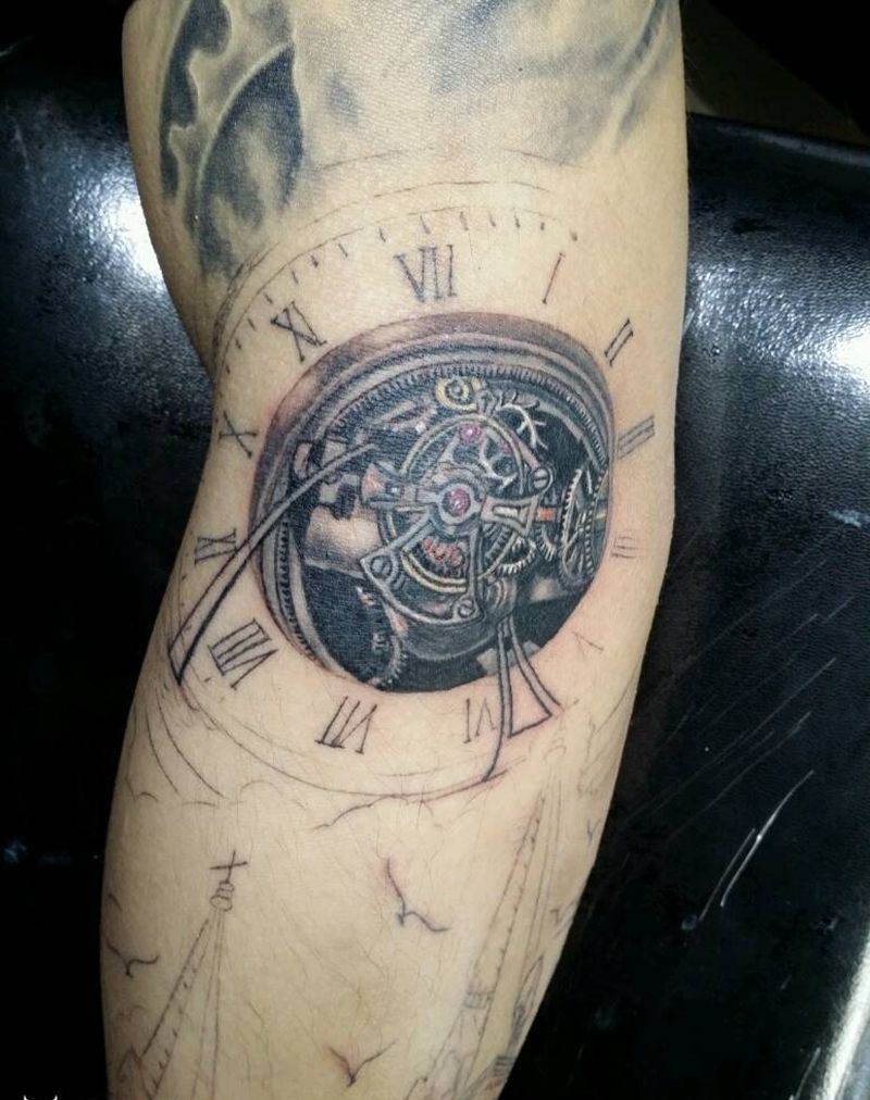 当前位置: 首页 >山西省太原市纹身店-太原翼龙刺青工作室纹身图案>陀飞轮纹身图片_手臂欧美写实静物成品手稿插画纹身图案