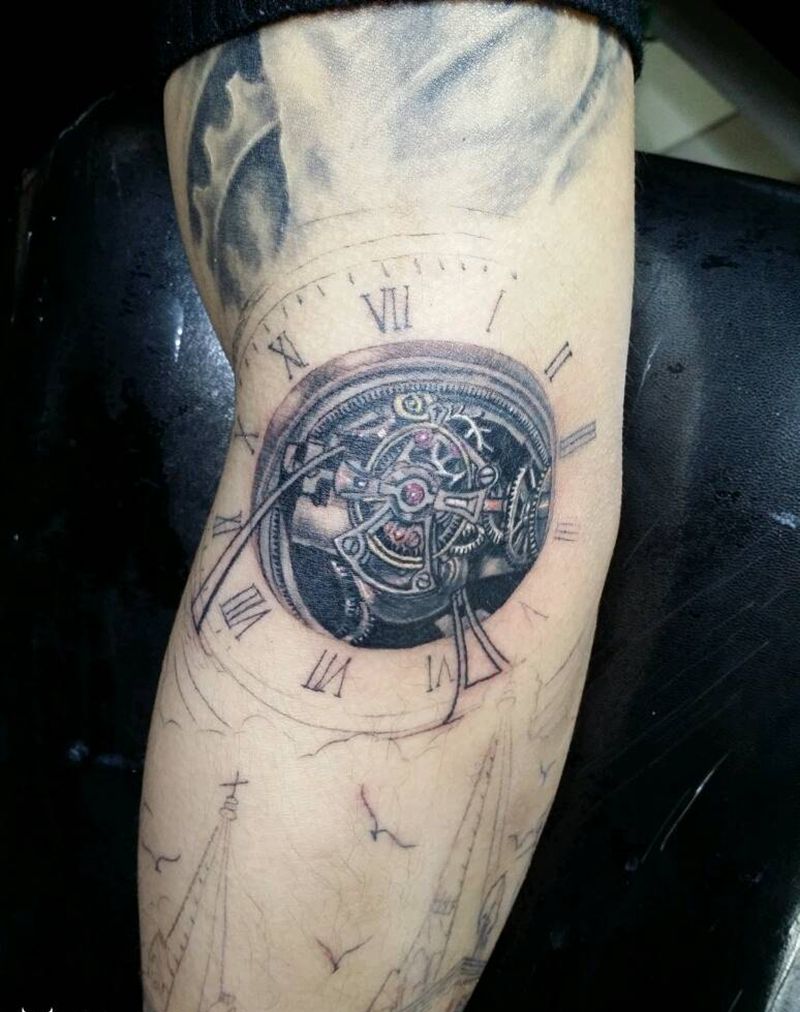 当前位置: 首页 >山西省太原市纹身店-太原翼龙刺青工作室纹身图案>陀飞轮纹身图片_手臂欧美写实静物成品手稿插画纹身图案