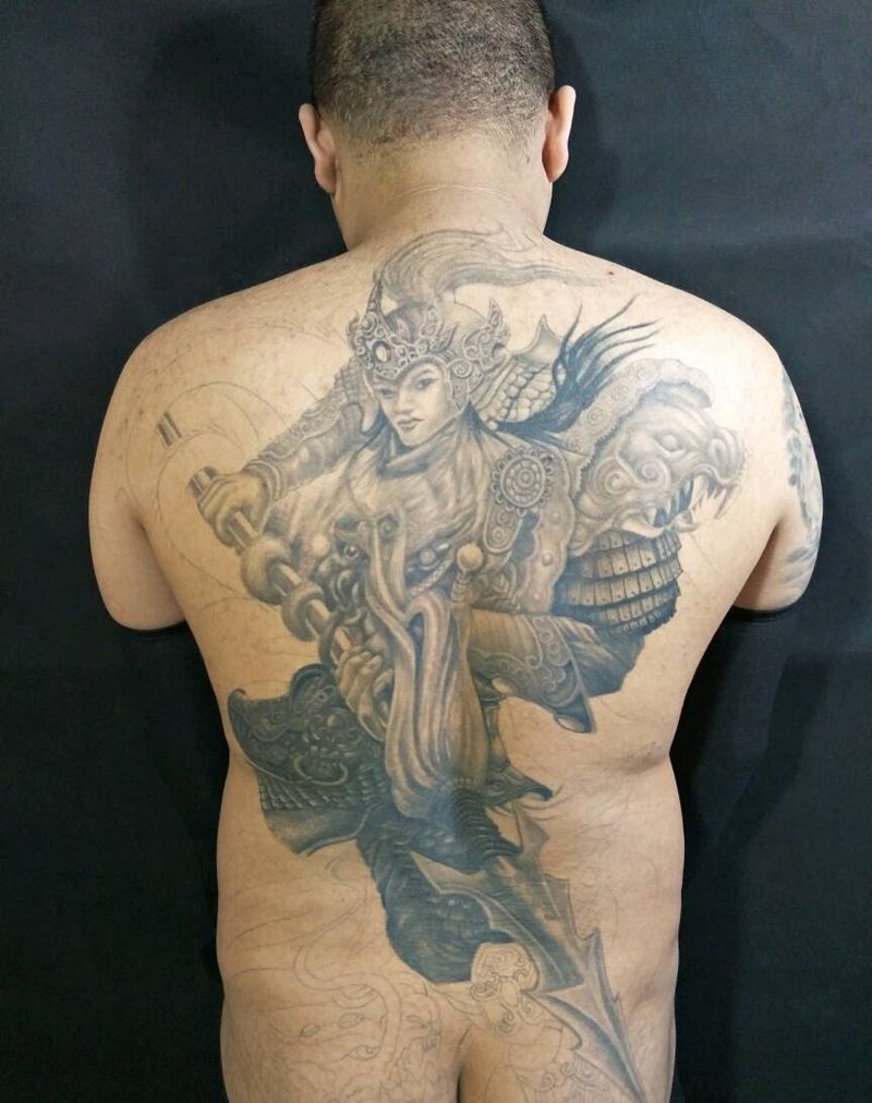 当前位置: 首页 >山西省太原市纹身店-太原翼龙刺青工作室纹身图案>龙临纹身图片_背部传统肖像人物纹身图案
