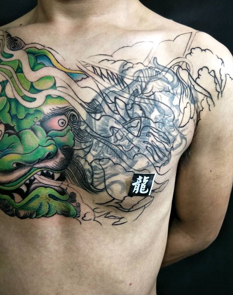 当前位置: 首页 >山西省太原市纹身店-太原翼龙刺青工作室纹身图案>花胸福狮纹身图片_胸部传统动物静物鬼神成品手稿纹身图案