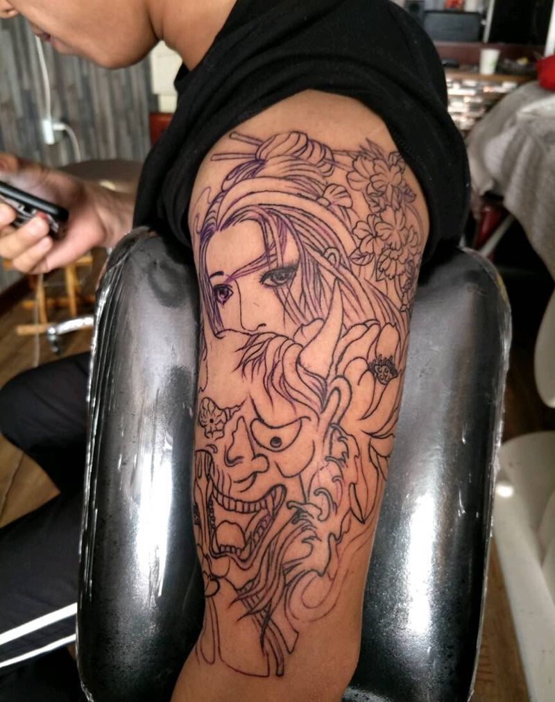 当前位置: 首页 >山西省太原市纹身店-太原翼龙刺青工作室纹身图案>艺妓纹身图片_肩部手臂欧美传统肖像人物成品手稿纹身图案