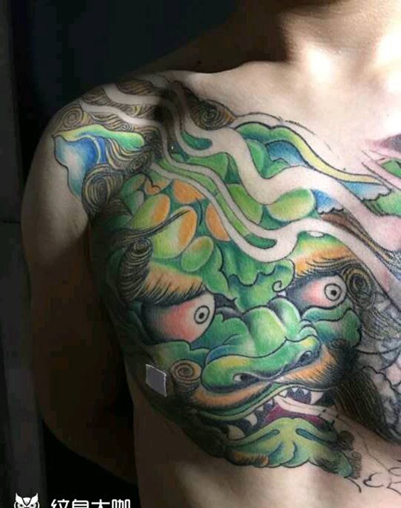 唐狮遮盖纹身图片_胸部传统动物植物成品手稿纹身图案